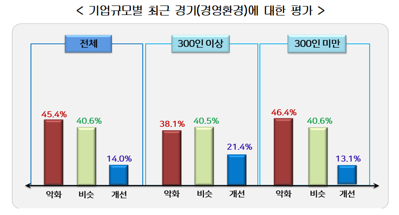한편 응답 기업 중 45.4%는 '경기가 전년보다 악화했다’라고 답했다. 특히 300인 미만 기업에서 경기 악화 응답을 한 비율이 46.4%로, 300인 이상 기업(38.1%)보다 높았다.
