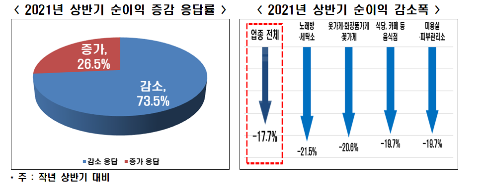 업종별 순이익 감소 폭은 △노래방ㆍ세탁소 등 기타업종 -21.5% △옷가게ㆍ화장품ㆍ꽃가게 -20.6% △식당ㆍ카페 등 음식점 -19.7% △미용실ㆍ피부관리소 -19.7% △부동산ㆍ인테리어ㆍ자동차수리점 등 개인 서비스 -16.1% △슈퍼마켓ㆍ편의점ㆍ정육점 등 식료 소매점 -14.8% △학원(예체능 포함) -14.2% 순이었다.
