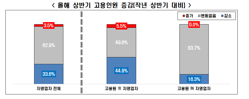조사에 응답한 자영업자 중 33.6%는 작년 상반기 대비 고용인원이 감소했고, 62.9%는 기존 고용인원을 유지했다고 답했다. 고용 인원을 늘렸다는 응답은 3.5%에 불과했다.