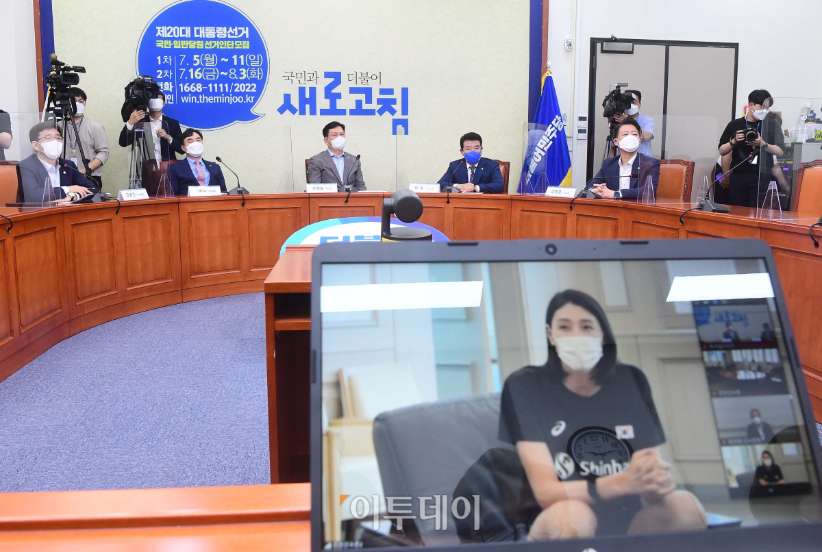 송영길 더불어민주당 대표 등이 12일 서울 여의도 국회 당 대표실에서 화상으로 열린 더불어민주당 2020 도쿄올림픽 출전 선수단 격려 미팅에서 선수단 주장인 김연경 선수의 인사말을 듣고 있다.