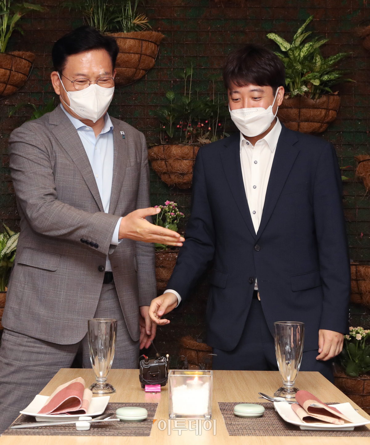 더불어민주당 송영길 대표와 국민의힘 이준석 대표가 12일 서울 여의도의 한 식당에서 만찬 회동을 하고 있다.
