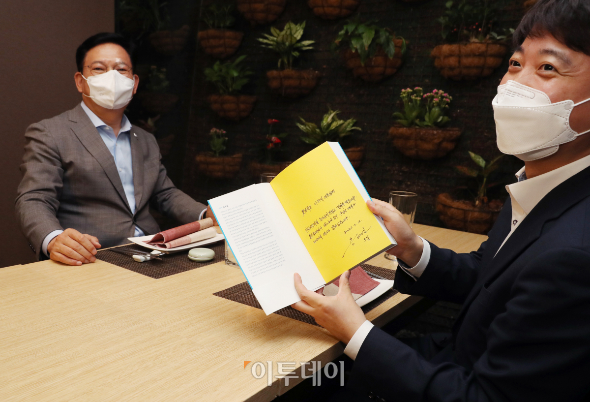 더불어민주당 송영길 대표와 국민의힘 이준석 대표가 12일 서울 여의도의 한 식당에서 만찬 회동을 하고 있다. 이 자리에서 송 대표의 저서 <룰을 지배하라>를 선물받은 이 대표가 송 대표의 메모를 보여주고 있다.