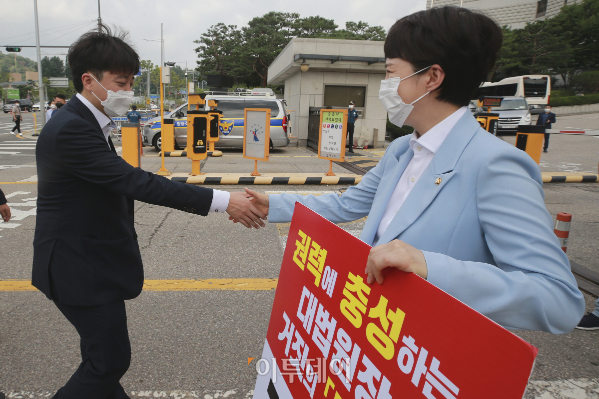 이준석 국민의힘 대표가 13일 오전 서울 서초동 대법원 앞에서 김명수 대법원장 사퇴를 촉구하며 릴레이 1인 시위를 하고 있는 김은혜 의원과 악수를 하고 있다. 국회사진취재단