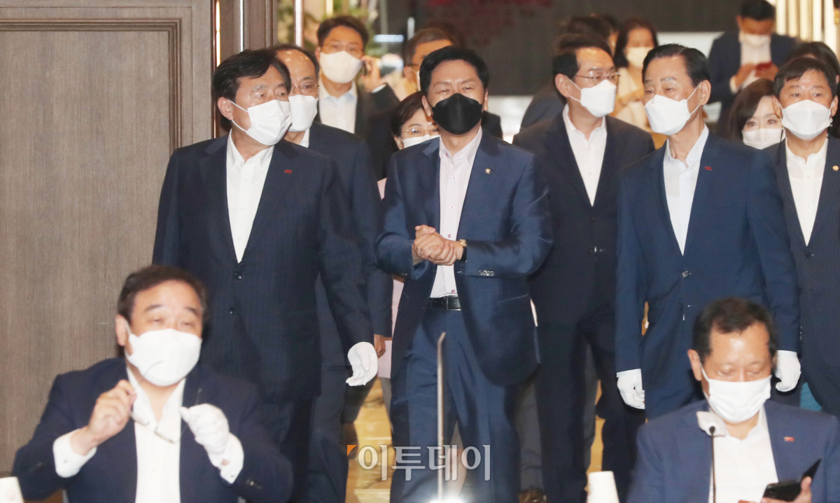 13일 여의도 중소기업중앙회에서 중소기업·소상공인·국민의힘 타운홀미팅이 열린 가운데 김기현 국민의힘 원내대표와 김기문 중소기업중앙회 회장등 참석자들이 미팅홀로 입장하고 있다.