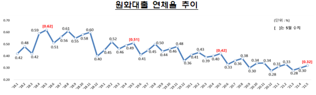 14일 금융감독원에 따르면 5월 말 현재 국내 은행의 원화대출 연체율(1개월 이상 원리금 연체 기준)은 1개월 전보다 0.01%포인트(p) 오른 0.32%로 집계됐다.