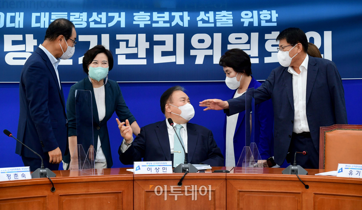 14일 서울 여의도 국회에서 열린 더불어민주당 중앙당선거관리위원회의에 앞서 이상민(가운데) 선관위원장과 정춘숙 부위원장, 서삼석 위원 등이 대화하고 있다.