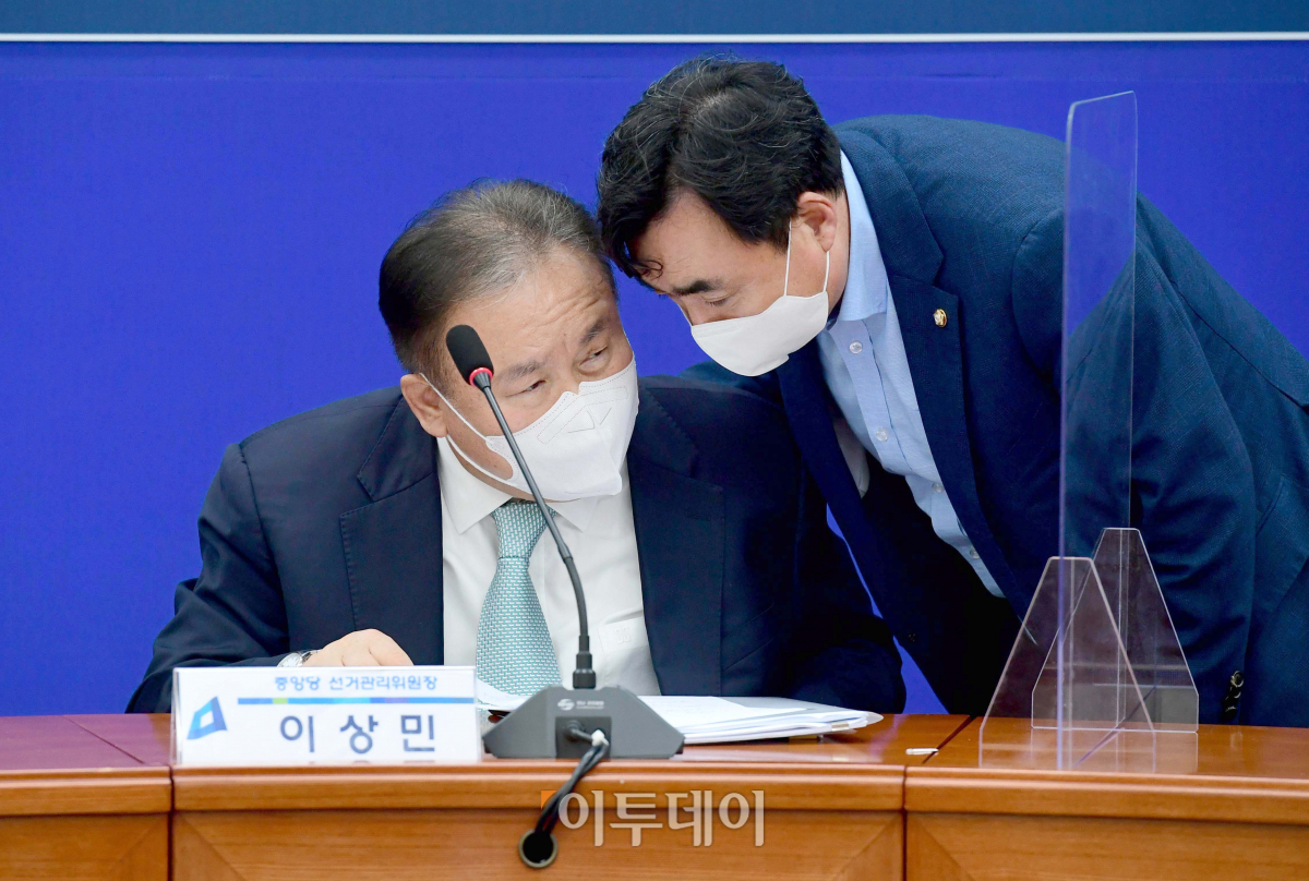 14일 서울 여의도 국회에서 열린 더불어민주당 중앙당선거관리위원회의에 앞서 이상민(왼쪽) 선관위원장과 윤관석 사무총장이 대화하고 있다.