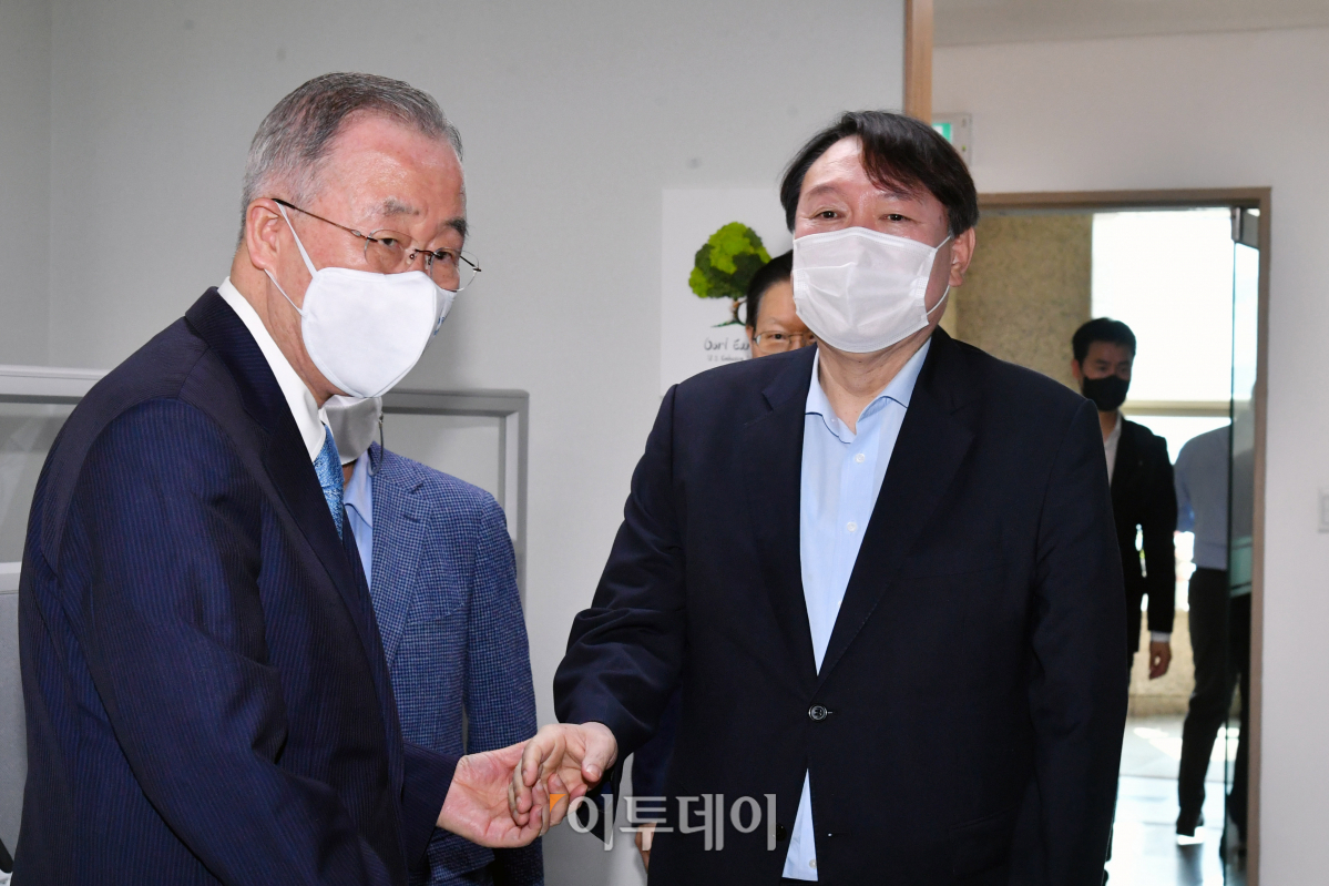 윤석열 전 검찰총장이 15일 서울 종로구 경희궁길 반기문재단에서 반 전 UN 사무총장을 예방하고 있다. 윤 전 총장은 환경과 외교안보에 대한 의견 뿐 아니라 정치활동에 대한 조언도 구할 예정이다. 국회사진취재단