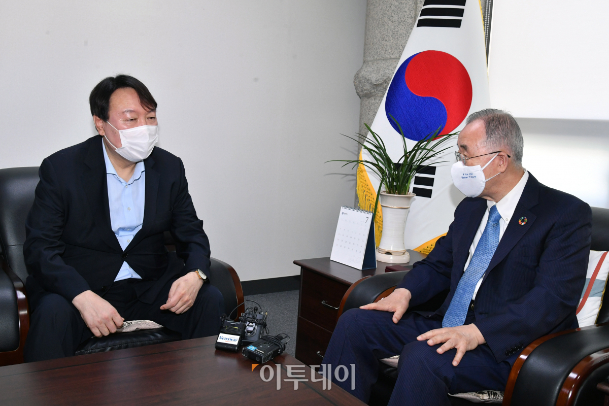 윤석열 전 검찰총장이 15일 서울 종로구 경희궁길 반기문재단에서 반 전 UN 사무총장을 예방하고 있다. 윤 전 총장은 환경과 외교안보에 대한 의견 뿐 아니라 정치활동에 대한 조언도 구할 예정이다. 국회사진취재단