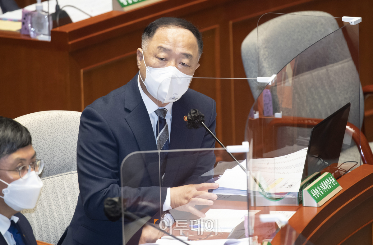홍남기 부총리 겸 기획재정부 장관이 15일 오전 서울 여의도 국회에서 열린 예산결산특별위원회 전체회의에서 의원들 질의에 답하고 있다.