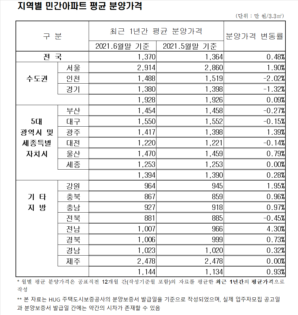 주택도시보증공사(HUG)에 따르면 6월 기준 전국 민간 아파트 분양가는 3.3㎡당 평균 1370만 원이다. 지난해 7월부터 올해 6월까지 1년간 분양보증서를 발급받은 민간 아파트 분양가를 평균 낸 값이다. 이달 조사에선 전달 조사(1364만 원)보다 평균 분양가가 0.48% 상승했다.