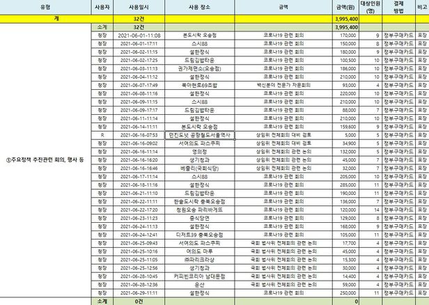 질병관리청이 14일 공개한 ’2021년 6월 질병관리청장 업무추진비 사용내역'에 따르면, 정 청장의 지난달 업무추진비 사용액은 399만5400원, 총 사용 횟수는 32건이었다. 여기에는 사용일시, 사용점포, 사용용도, 가격, 대상 인원 등이 자세히 기록돼 있다.