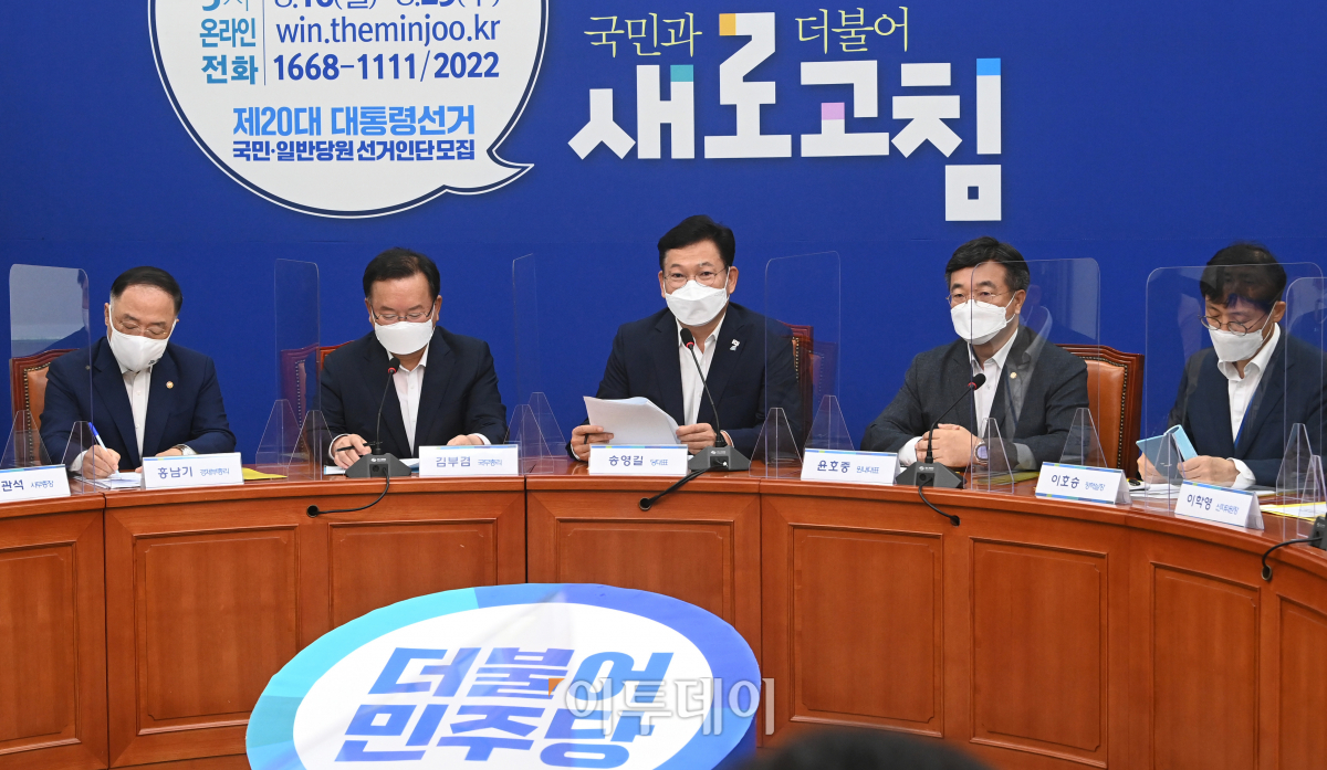 더불어민주당 송영길 대표가 19일 서울 여의도 국회에서 열린 고위당정협의회에서 모두발언을 하고 있다.