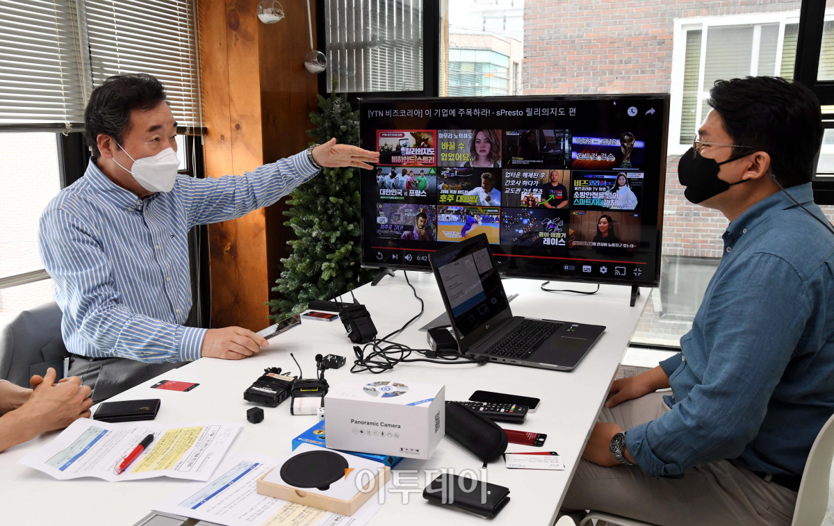 더불어민주당 이낙연 전 대표가 19일 서울 마포구 에스프레스토에서 열린 딥페이크 피해근절을 위한 대담회에 참석, 에스프레스토 손동현 대표와 불법카메라 탐지 기능과 예방을 위한 의견을 나누고 있다. 국회사진취재단