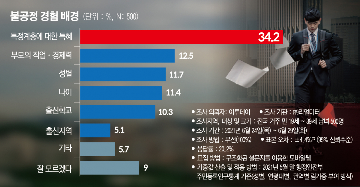 이투데이가 리얼미터에 의뢰해 지난달 24일부터 닷새간 전국 19~39세 남녀 500명에게 실시한 ‘20·30대 인식조사’ 결과(표본오차 95% 신뢰수준 ±4.4%포인트(P)), 불공정 경험 응답자의 34.2%는 그 배경으로 ‘특정 계층에 대한 특혜’를 꼽았다. 이어 ‘부모의 직업·경제력(12.5%)’, ‘성별(11.7%)’, ‘나이(11.4%)’, ‘출신학교(10.3%)’, ‘출신지역(5.1%)’ 등 순이었다.