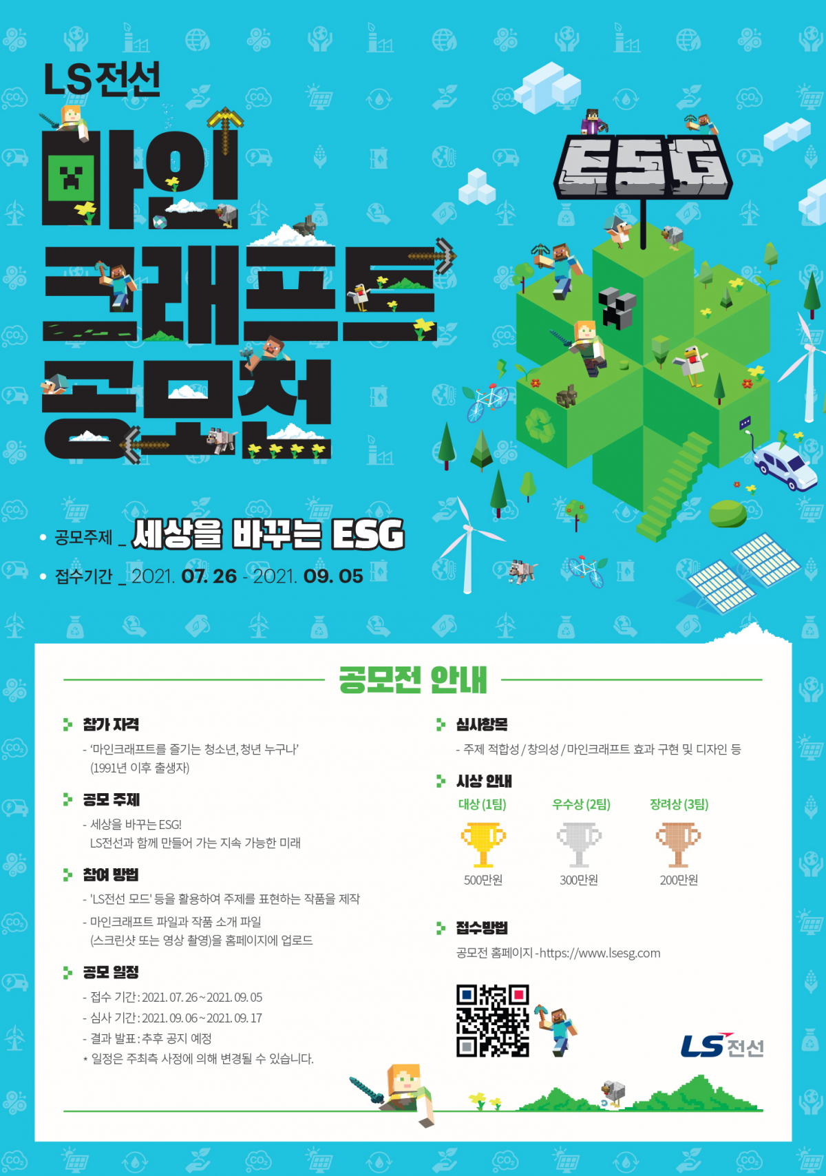 LS전선은 20일 마인크래프트 ESG(환경ㆍ사회ㆍ지배구조) 공모전 '세상을 바꾸는 ESG’ 대회를 개최한다고 밝혔다.