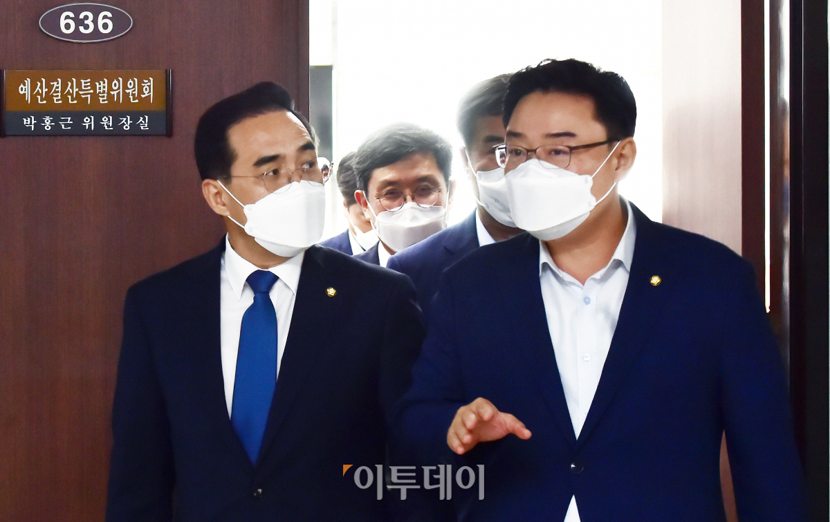 박홍근 국회 예결위원장(왼쪽), 김성원 국민의힘(야당) 간사가 20일 서울 여의도 국회 본관 638호에서 열린 국회 예산결산특별위원회 2021년도 제2회 추경예산안 등 조정소위원회에 앞서 대화를 나누며 회의실로 이동하고 있다.