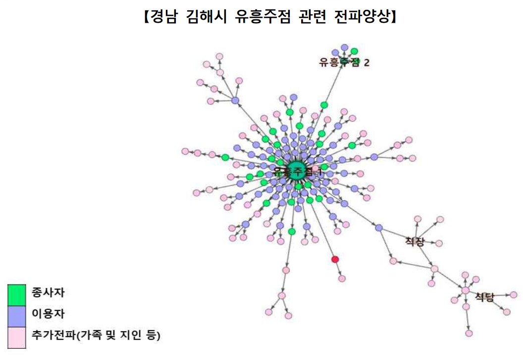 최근 경남 김해시 유흥주점에선 종사자 선제검사에서 확진됐는데 증상 발생 기간 중 다수의 시설에서 근무를 지속하여 동료 및 이용자 95명(전체 발생의 57%) 및 가족·지인 등에게 추가전파 되어 19일 기준 총 188명의 확진자가 발생했다.