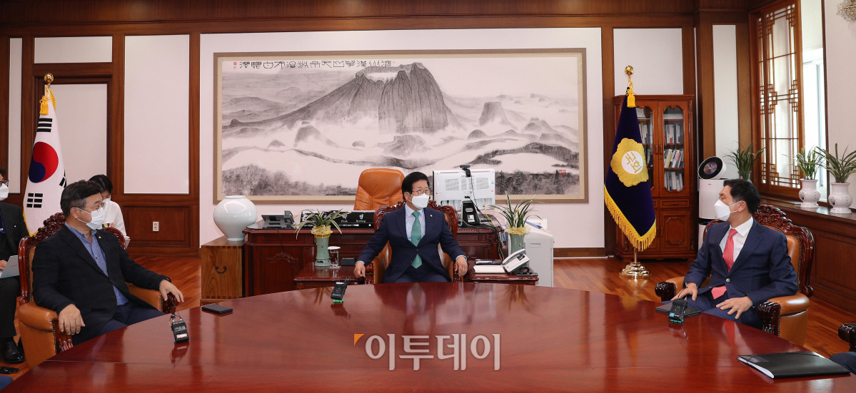 박병석 국회의장 주재(가운데)로 21일 오전 국회 의장 집무실에서 윤호중 더불어민주당 원내대표(왼쪽)와 김기현 국민의힘 원내대표가 회동 하고 있다.