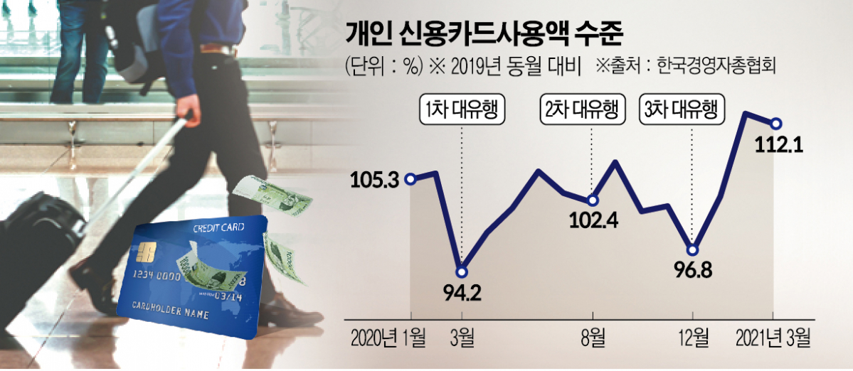 한국경영자총협회가 22일 발표한 ‘개인 신용카드 데이터로 분석한 품목별 소비 현황과 시사점’에 따르면 코로나19로 어려움을 겪은 지난해 연간 개인 신용카드 사용액(550조 원)은 2019년(539조 원) 대비 102.1% 수준으로 유사했으나, 올해 3월(49조9000억 원)에는 2019년 3월(44조5000억 원) 대비 112.1% 수준까지 상승했다.