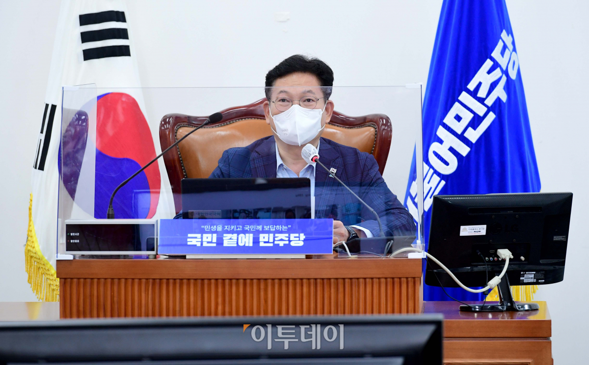 송영길 더불어민주당 대표가 22일 서울 여의도 국회에서 화상으로 열린 더불어민주당 의원총회에서 모두발언을 하고 있다.