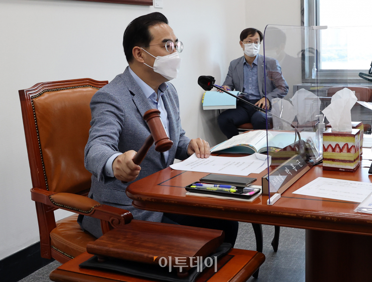 22일 국회에서 열린 제3차 예산결산특별위원회 2021년도 제2회 추경예산안 등 조정소위원회에서 박홍근 소위원장이 의사봉을 두드리고 있다.