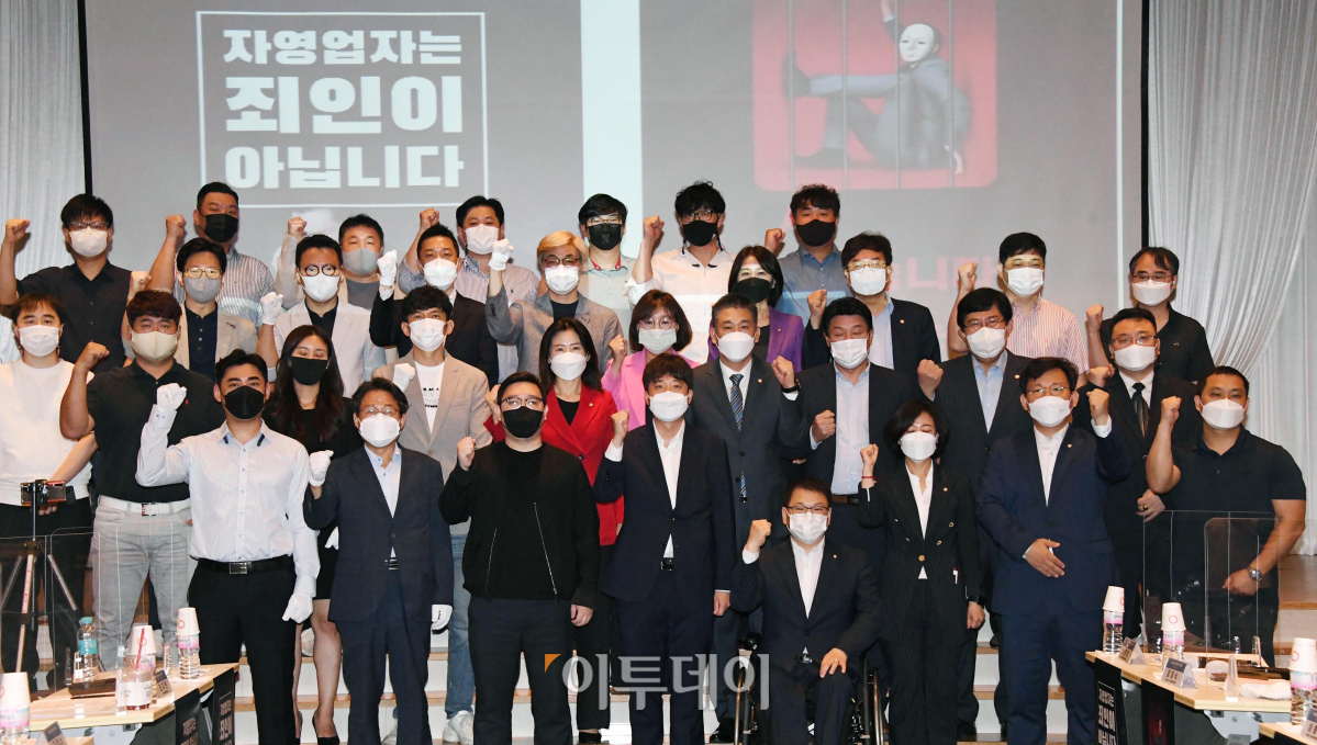 국민의힘 이준석대표가 22일 오전 서울시 마포구 상암동 DMC타워에서 열린 중소상공인 자영업자-국민의힘 현안간담회에서 참석자들과 '힘내라 중소상공인'을 외치고 있다. 국회사진취재단
