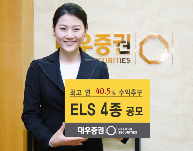 대우증권은 오는 20일부터 최고 연 40.5% 수익을 추구하는 ELS 3종을 공모한다고 19일 밝혔다. 이번 ELS 4종은 KOSPI200, 한국전력, LG전자, 삼성중공업 등을 기초자산으로 하며 총 550억원 규모로 공모한다.