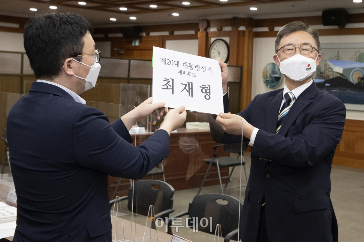 국민의힘 소속 최재형 전 감사원장(오른쪽)이 26일 오전 경기 과천시 중앙선거관리위원회에서 대선 예비후보 등록을 하고 있다. 국회사진취재단