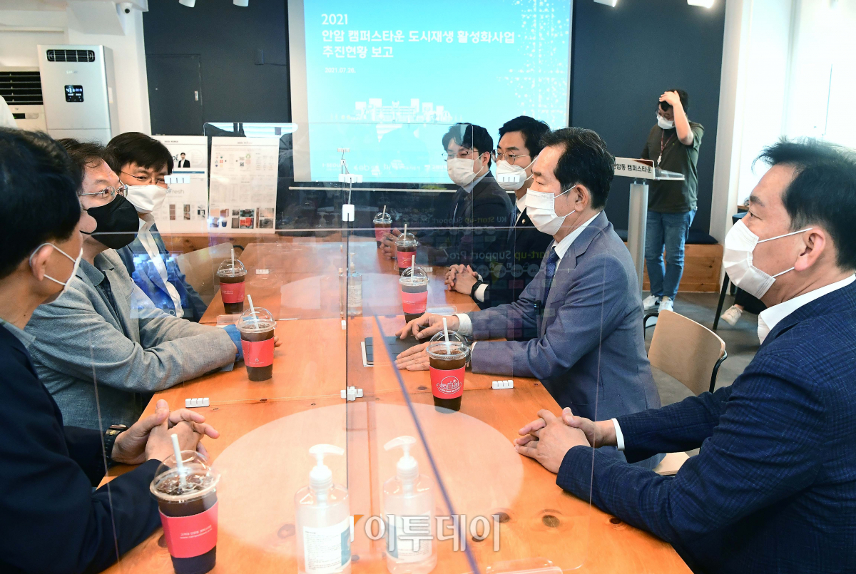 더불어민주당 대선주자인 정세균 전 국무총리가 ‘직장·주거 걱정 없는 창업밸리’ 현장 방문차 26일 서울 성북구 고려대 캠퍼스타운 창업카페를 찾아 ‘안암 캠퍼스타운 도시재생 활성화사업’ 추진현황을 듣기 앞서 관계자들과 대화하고 있다.