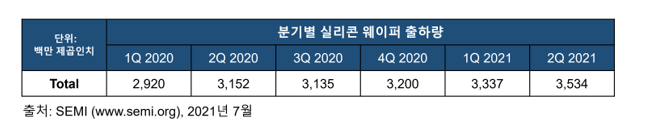 반도체 수요 증가로 2분기에도 반도체 원재료인 실리콘 웨이퍼 출하량이 역대 최대치를 경신한 것으로 나타났다. 앞서 올해 1분기 실리콘 웨이퍼 출하량이 사상 최고치 기록을 세웠는데, 이를 한 분기 만에 갈아치운 것이다.