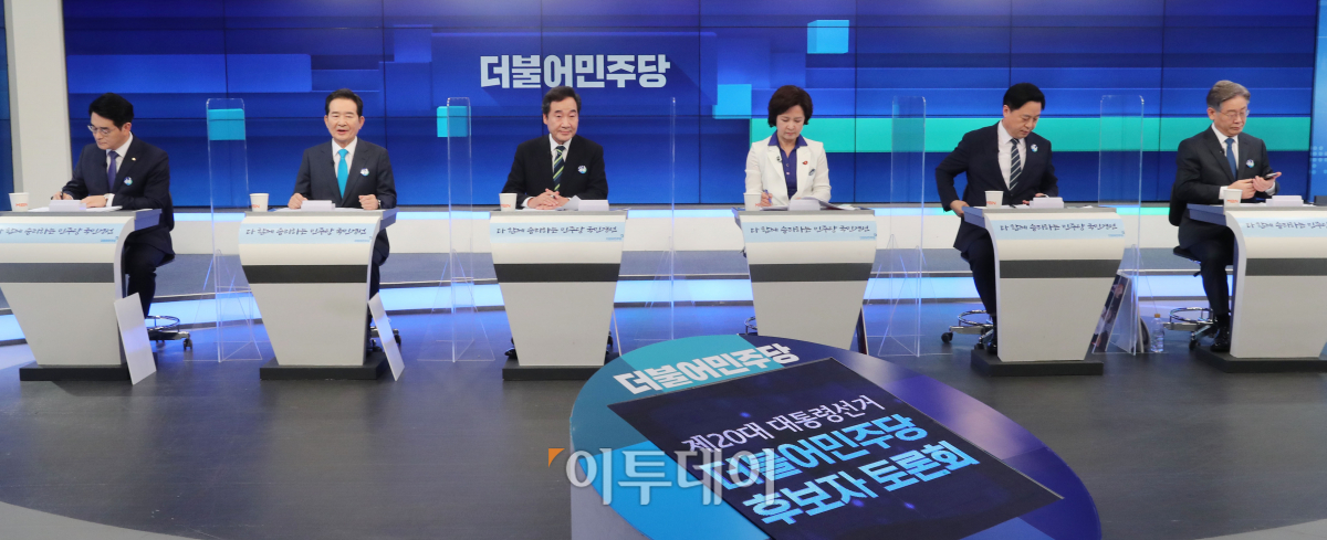 28일 서울 중구 MBN에서 민주당 본경선 1차 TV토론회가 열린 가운데 참석한 후보들이 시작에 앞서 토론준비를 하고 있다. (왼쪽부터)박용진,정세균,이낙연,추미애,김두관,이재명 후보. 국회사진취재단