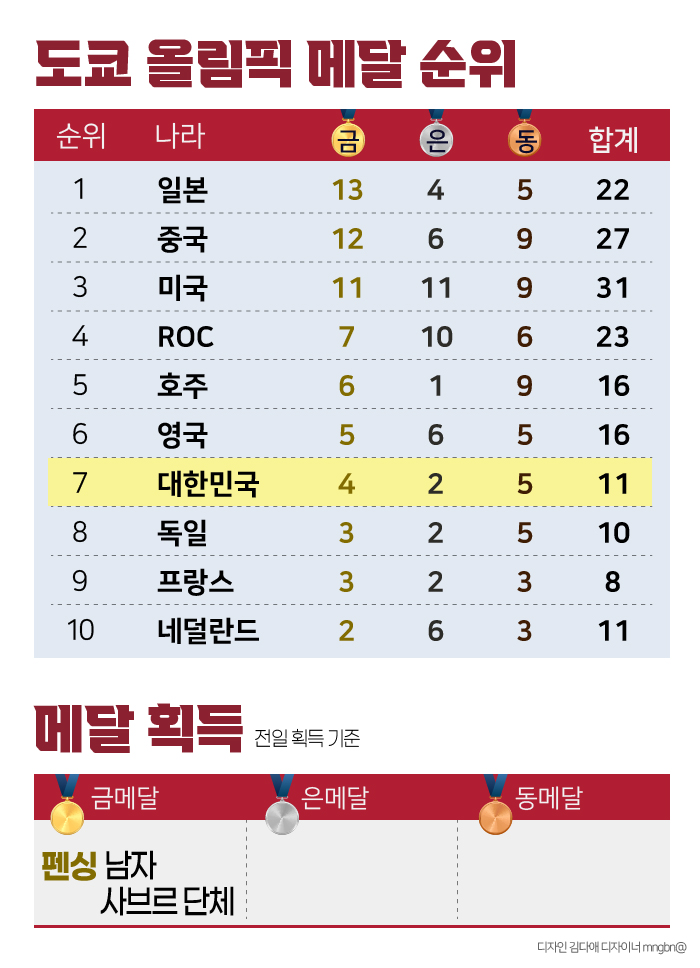 2020 도쿄올림픽 7일 차, 국가별 메달 순위를 보면 개최국 일본이 금메달 13개, 은메달 4개, 동메달 5개로 종합순위 1위를 기록했다. 한국은 28일 펜싱 남자 사브르 단체전 금메달을 추가해 종합순위 7위에 올라있다.