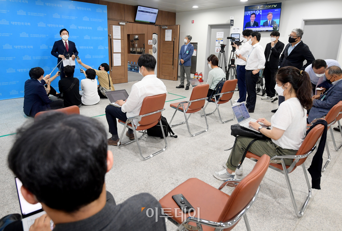 원희룡 제주지사가 29일 오전 서울 여의도 국회 소통관에서 '원희룡의 국가찬스 1호 공약: 주택 국가찬스' 기자회견을 마치고 취재진의 질문에 답하고 있다.