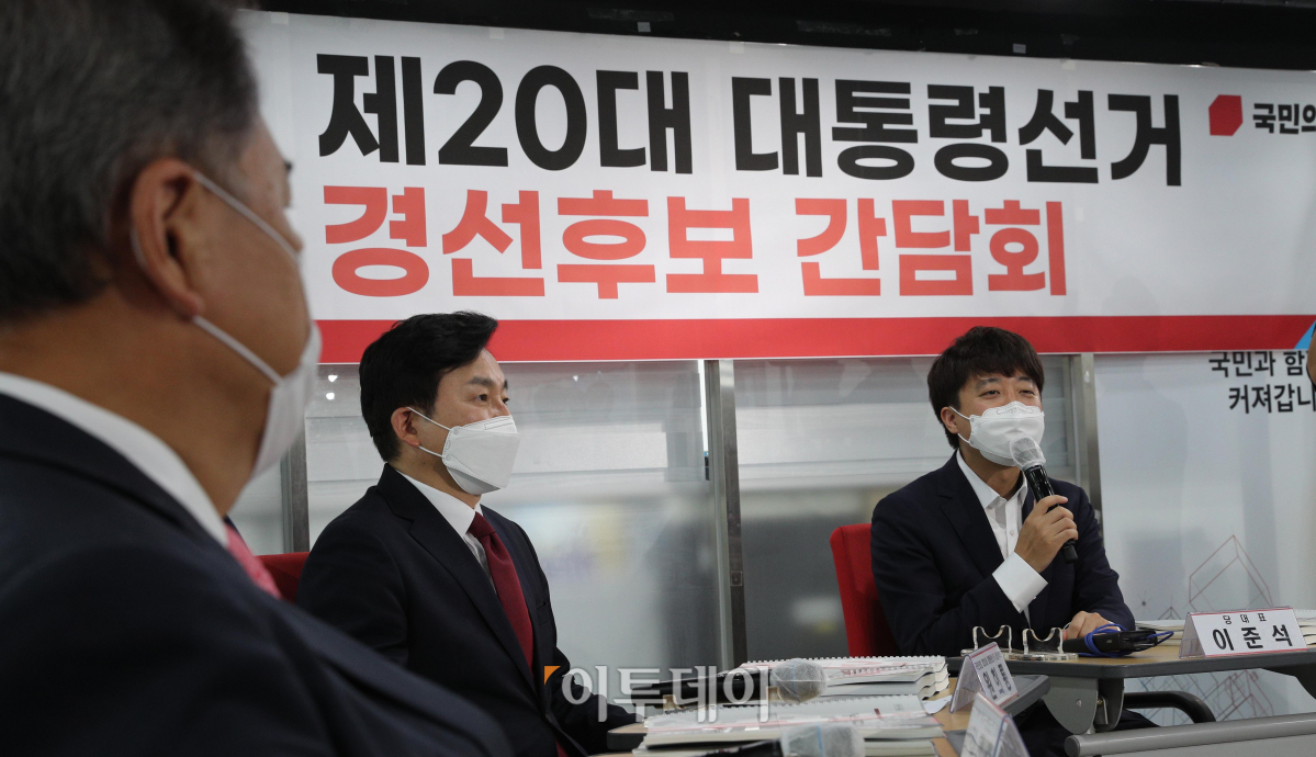 이준석 국민의힘 대표와 서병수 국민의힘 경선준비위원장 주재로 29일 오후 서울 여의도 국민의힘 중앙당사에서 열린 ‘제20대 대통령선거 경선 후보 간담회’가 열리고 있다. 이 자리엔 당내 대권 주자인 김태호, 박진, 안상수, 유승민, 윤희숙, 원희룡, 장기표, 최재형, 하태경, 홍준표, 황교안 등 예비후보 11명이 참석했다.