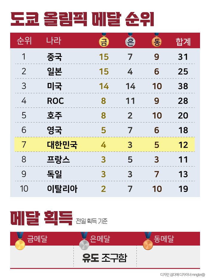 2020 도쿄올림픽 8일 차, 국가별 메달 순위를 보면 중국이 금메달 15개, 은메달 7개, 동메달 9개로 종합순위 1위를 기록했다. 한국은 29일 유도 조구함의 은메달을 추가해 종합순위 7위에 올라있다.