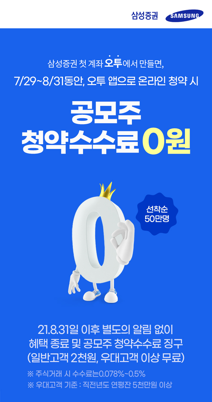 이번 이벤트는 8월 31일까지 진행되며, 해당 기간 동안 삼성증권의 첫 계좌를 오투 앱에서 개설한 고객 중 선착순 50만 명에게 온라인 공모주 청약 배정 시 발생하는 건 당 2000원의 청약수수료를 8월 한 달간 면제해준다.