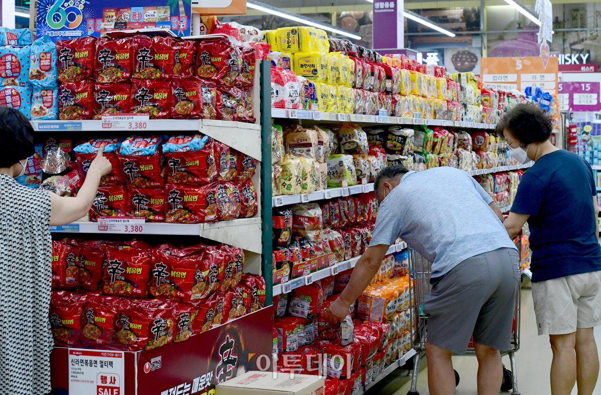 오뚜기가 진라면 등 주요 라면 가격을 평균 11.9% 인상한 1일 서울의 한 대형마트에서 시민들이 라면을 살펴보고 있다. 원가 압박과 인건비 상승으로 인한 오뚜기의 라면값 인상은 2008년 4월 이후 13년 4개월만이며, 농심도 4년 8개월만인 오는 16일부터 신라면 등 주요 라면의 출고가격을 평균 6.8% 인상하기로 했다.
