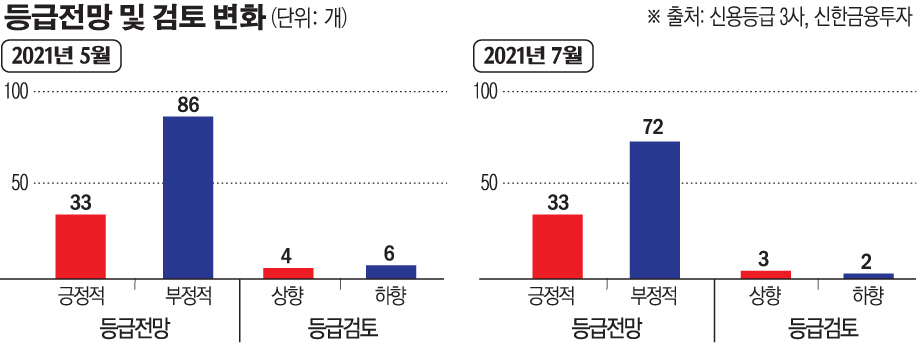1일 신용평가 3사와 신한금융투자에 따르면 지난달 ‘부정적’ 등급 전망을 받은 기업은 72개로 5월(86개) 대비 14개가 줄었다. ‘긍정적’ 등급 전망은 33개로 5월과 같다.