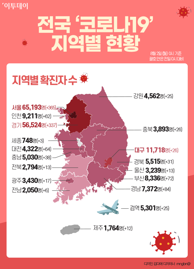 전국 시·도별 코로나19 누적 확진자 수는 △서울 6만5193명 △경기 5만6524명으로 가장 많은 비중을 차지했다. 이어 △대구 1만1718명 △인천 9211명 △부산 8336명 △경남 7372명 △경북 5515명 △검역 5301명 △충남 5030명 △강원 4562명 △대전 4322명 △충북 3893명 △광주 3430명 △울산 3239명 △전북 2794명 △전남 2050명 △제주 1764명 △세종 748명 순으로 나타났다.