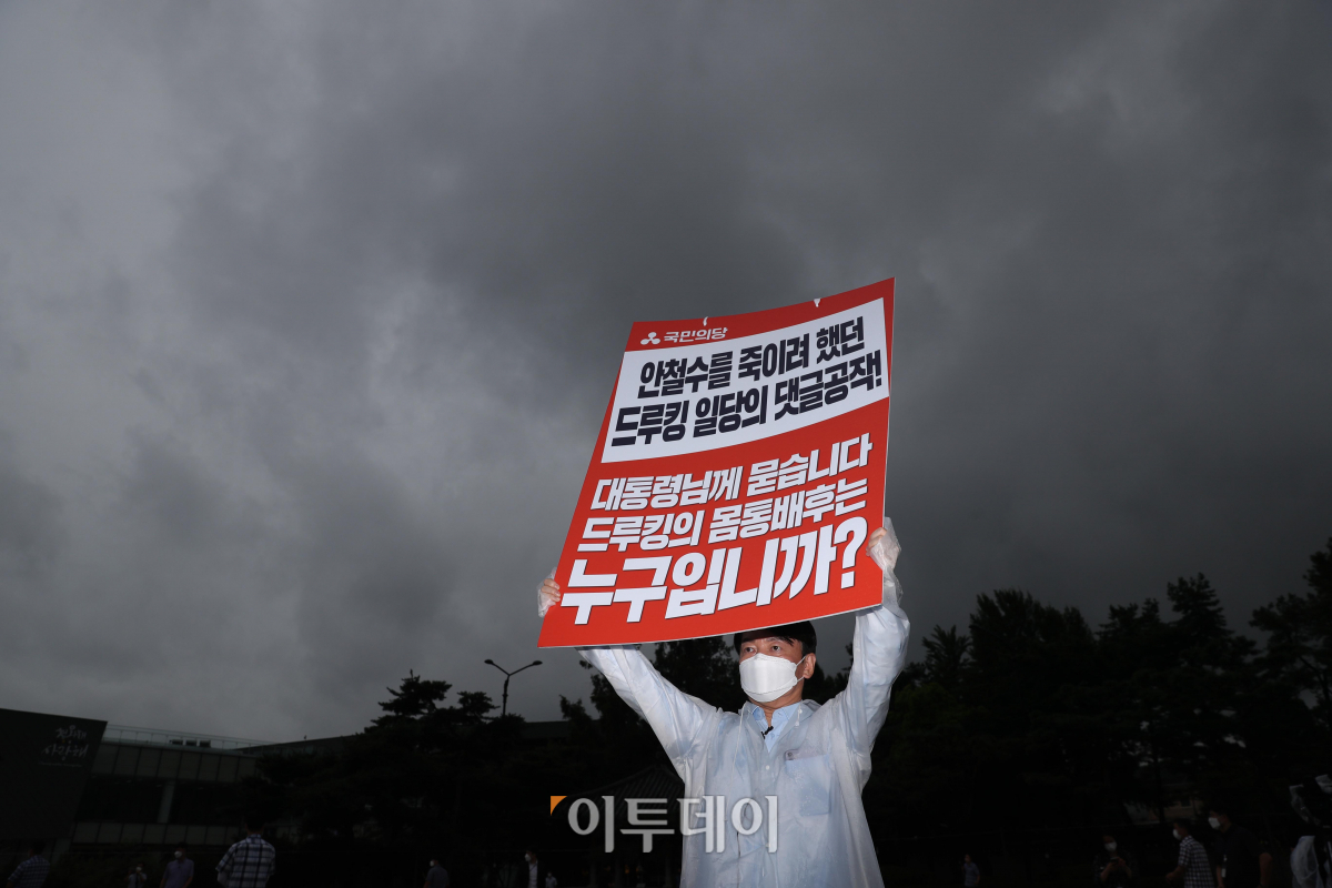안철수 국민의당 대표가 2일 오전 청와대 분수대 앞에서 드루킹 몸통배후 수사 및 대통령 진실고백 촉구 당지도부 릴레이 1인 시위를 하고 있다. 국회사진취재단