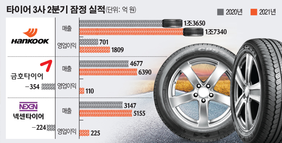지난해 2분기 수백억 원에 달하는 영업손실을 낸 금호와 넥센타이어는 올해 흑자 전환에 성공했다.