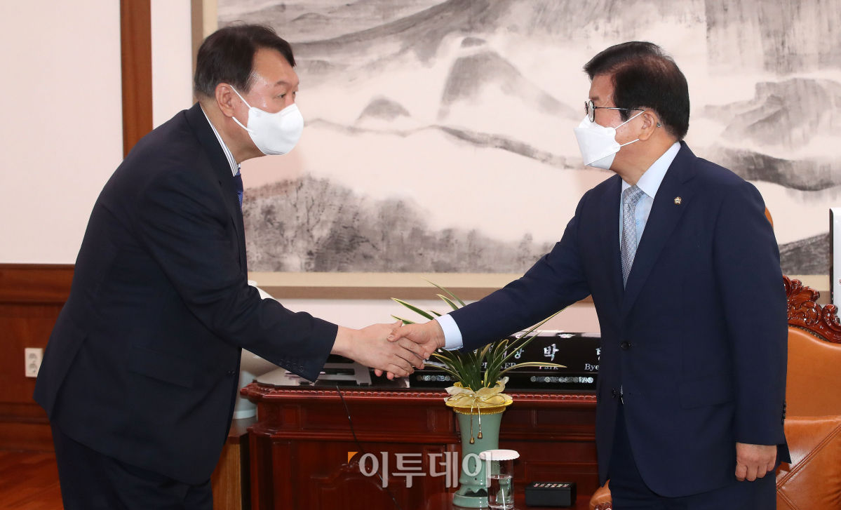 국민의힘 대선 예비후보인 윤석열 전 검찰총장이 3일 오전 서울 여의도 국회에서 박병석 국회의장을 예방하고 있다.