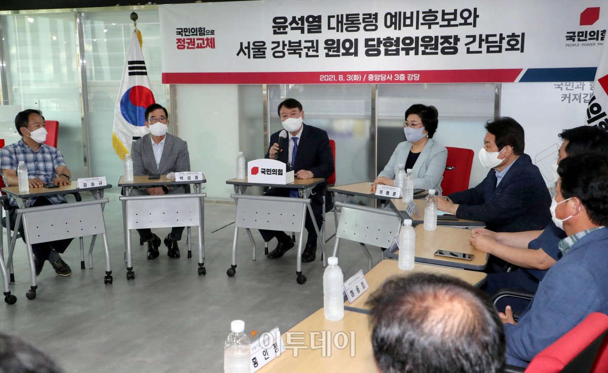 3일 오전 서울 여의도 국민의힘 당사에서 윤석열 대통령 예비후보가 서울시 강북권 원외당협위원장 간담회에서 발언을 하고 있다.