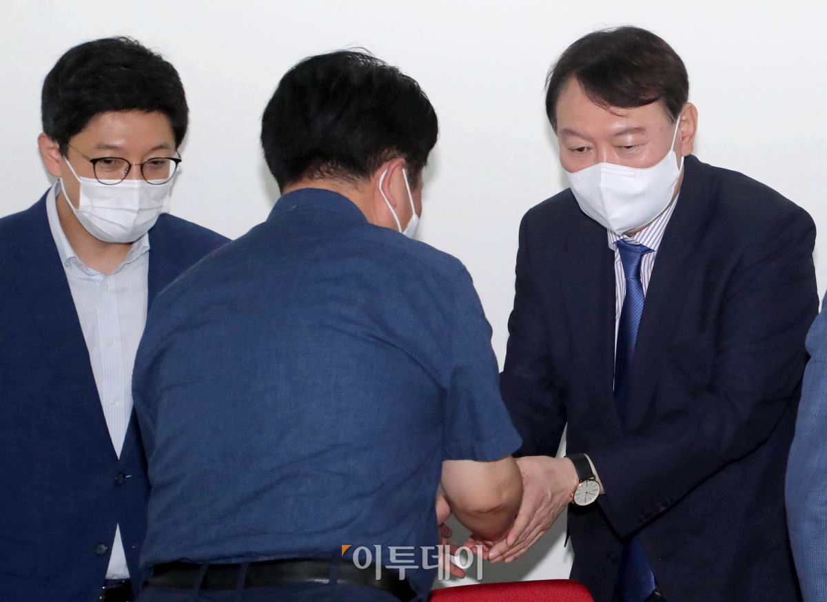 3일 오전 서울 여의도 국민의힘 당사에서 윤석열 대통령 예비후보가 서울시 강북권 원외당협위원장 간담회에서 참석자들과 인사를 하고 있다.