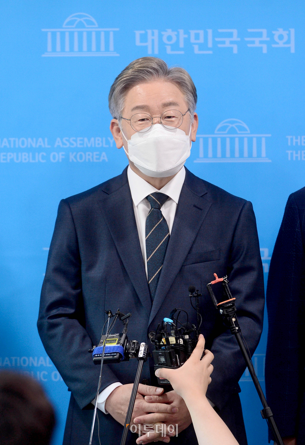 더불어민주당 대선 예비후보인 이재명 경기도 지사가 3일 오후 서울 여의도 국회 소통관에서 기자들의 질문에 답변을 하고 있다.