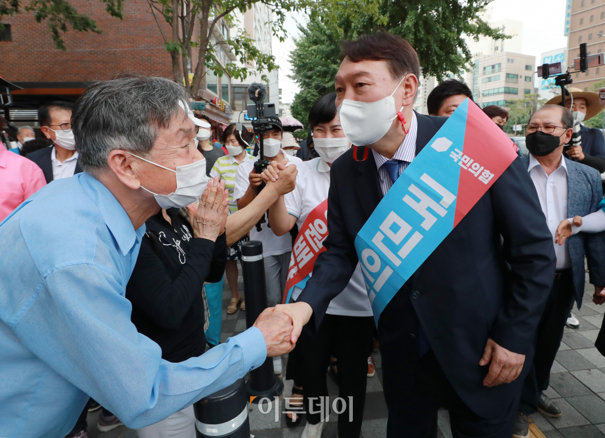 윤석열 국민의힘 대선 예비후보가 3일 오후 서울 은평구 응암역 앞에서 국민의힘 당원 가입을 독려하는 홍보 활동을 위해 이동하며 지지자들과 악수하고 있다. 국회사진취재단