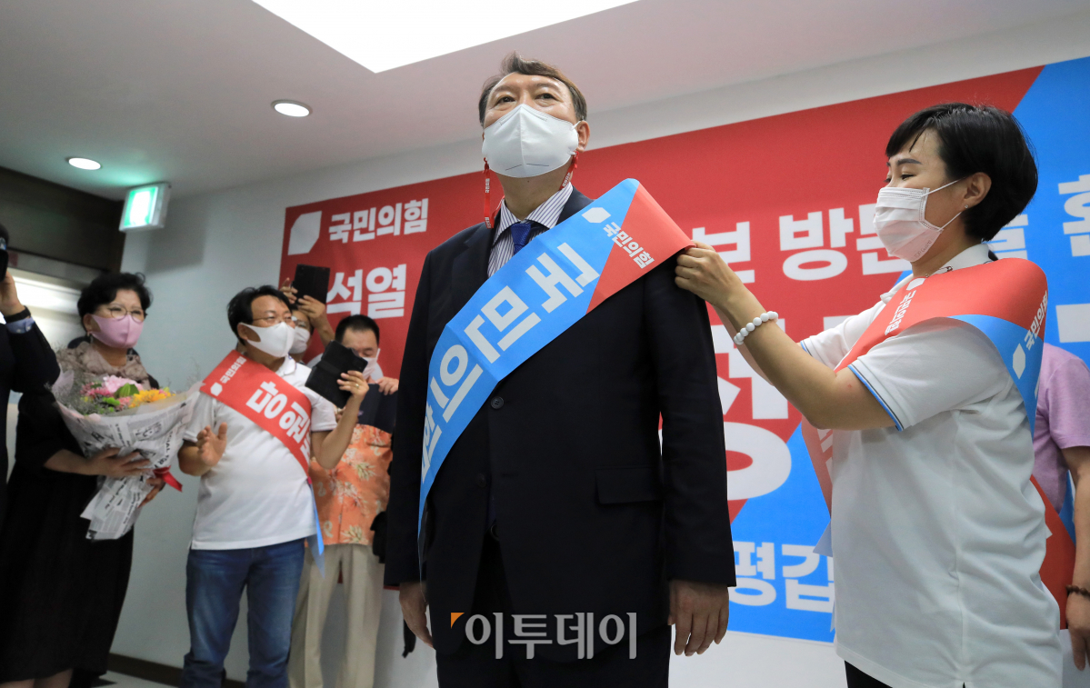 [포토] 국민의힘 어깨띠 두르는 윤석열 예비후보