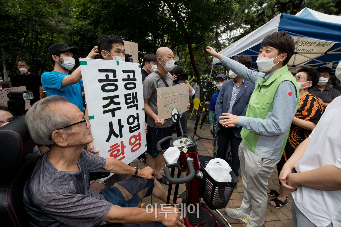 국민의힘 대선경선후보들이 4일 오전 서울 용산구 동자동 쪽방촌을 찾아 삼계탕과 물을 혹서 취약계층인 기후약자분들에게 나눠주는 자원봉사행사를 갖고 있다. 경선후보중에서는 김태호, 안상수, 윤희숙, 원희룡, 장기표, 장성민, 이소연(최재형 후보 부인), 하태경, 황교안(가나다순) 후보가 참석했다. 이준석 대표가 주민들과 대화를 하고 있다. 국회사진취재단
