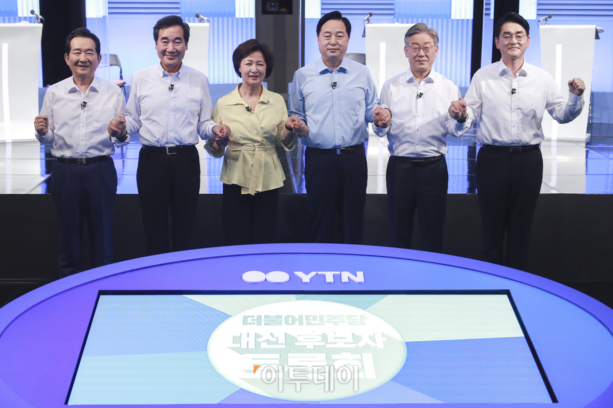 정세균(왼쪽부터), 이낙연, 추미애, 김두관, 이재명, 박용진 더불어민주당 대선 경선 후보가 4일 오후 서울 마포구 상암동 YTN에서 열린 대선 후보자 토론회를 앞두고 기념촬영을 하고 있다. 국회사진취재단